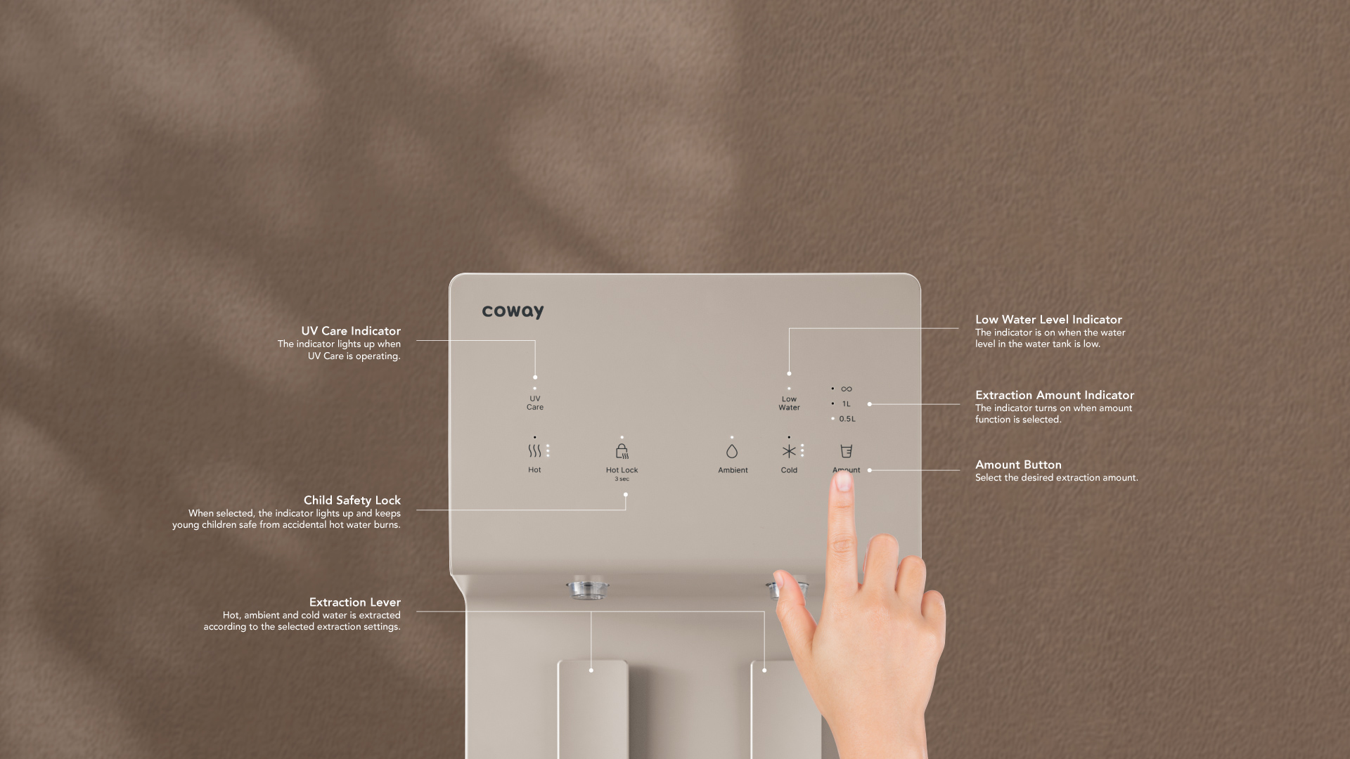 这是第一台拥有6级过滤系统的立式Coway净水器,其中包括UV杀菌功能,紫外线照射保持水源清洁无污染,防止霉菌和细菌滋生,确保水质纯净透明